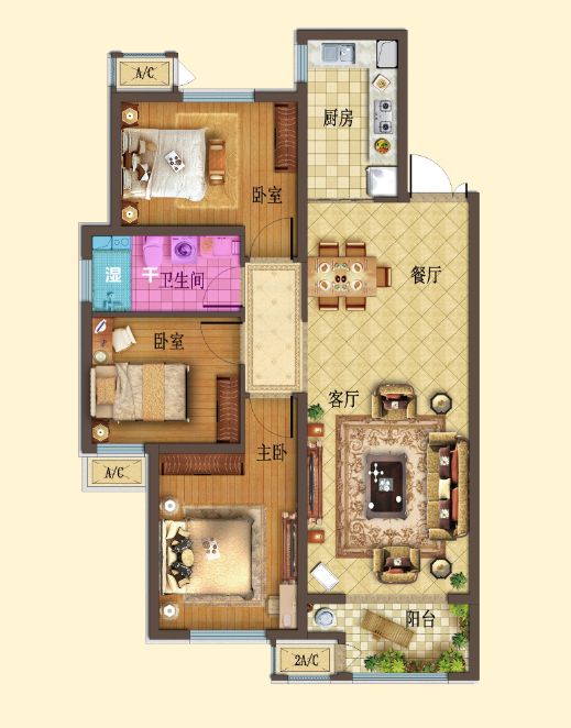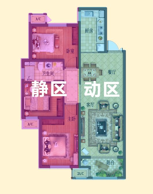 动区:公共活动区,全家用餐、休闲娱乐、接待客人